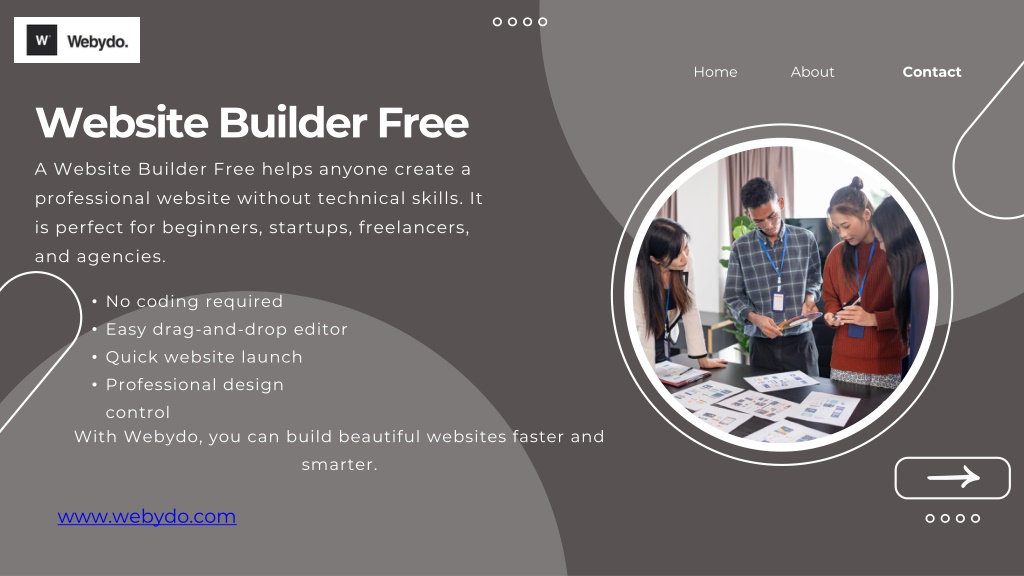 2. Home About Contact • Website Builder Free A Website Builder Free helps anyone create a professional website without technical skills. It is perfect for beginners, startups, freelancers, and agencies. • No coding required • Easy drag-and-drop editor • Quick website launch • Professional design control With Webydo, you can build beautiful websites faster and smarter. www.webydo.com