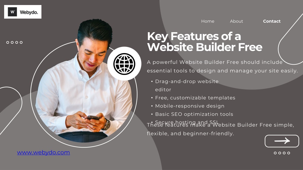 3. Home About Contact • Key Features of a Website Builder Free A powerful Website Builder Free should include essential tools to design and manage your site easily. • Drag-and-drop website editor • Free, customizable templates • Mobile-responsive design • Basic SEO optimization tools • Secure hosting and SSL These features make a Website Builder Free simple, flexible, and beginner-friendly. www.webydo.com