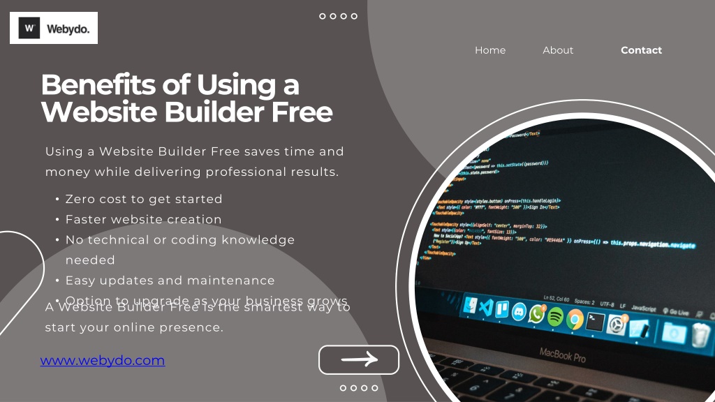 4. Home About Contact • Benefits of Using a Website Builder Free Using a Website Builder Free saves time and money while delivering professional results. • Zero cost to get started • Faster website creation • No technical or coding knowledge needed • Easy updates and maintenance • Option to upgrade as your business grows A Website Builder Free is the smartest way to start your online presence. www.webydo.com