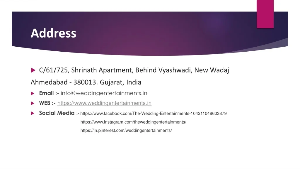 Address • C/61/725, Shrinath Apartment, Behind Vyashwadi, New Wadaj Ahmedabad - 380013, Gujarat,India • Email :- info@weddingentertainments.in • WEB :- https://www.weddingentertainments.in • Social Media :- https://www.facebook.com/The-Wedding-Entertainments-104211048603879 https://www.instagram.com/theweddingentertainments/ https://in.pinterest.com/weddingentertainments/