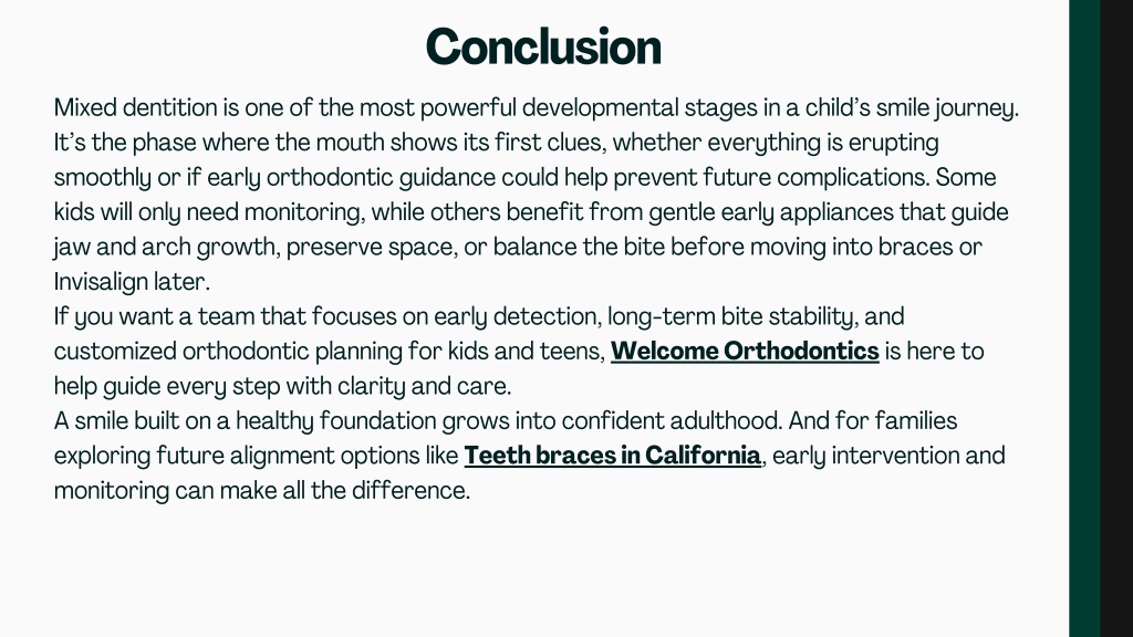 Conclusion Mixed dentition is one of the most powerful developmental stages in a child’s smile journey. It’s the phase where the mouth shows its first clues, whether everything is erupting smoothly or if early orthodontic guidance could help prevent future complications. Some kids will only need monitoring, while others benefit from gentle early appliances that guide jaw and arch growth, preserve space, or balance the bite before moving into braces or Invisalign later. If you want a team that focuses on early detection, long-term bite stability, and customized orthodontic planning for kids and teens, Welcome Orthodontics is here to help guide every step with clarity and care. A smile built on a healthy foundation grows into confident adulthood. And for families exploring future alignment options like Teeth braces in California, early intervention and monitoring can make all the difference.