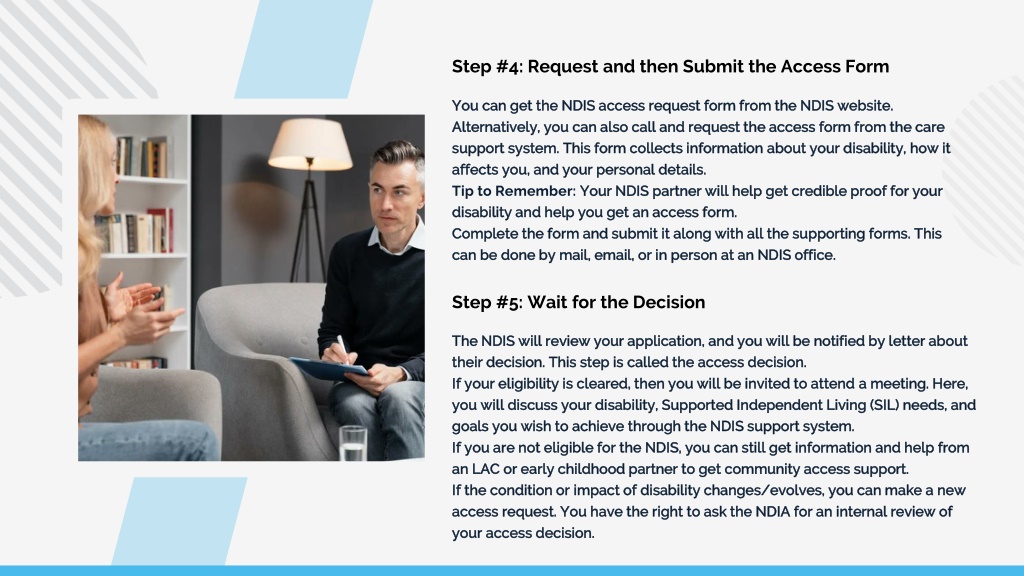 Step #4: Request and then Submit the Access Form You can get the NDIS access request form from the NDIS website. Alternatively, you can also call and request the access form from the care support system. This form collects information about your disability, how it affects you, and your personal details. Tip to Remember: Your NDIS partner will help get credible proof for your disability and help you get an access form. Complete the form and submit it along with all the supporting forms. This can be done by mail, email, or in person at an NDIS office. Step #5: Wait for the Decision The NDIS will review your application, and you will be notified by letter about their decision. This step is called the access decision. If your eligibility is cleared, then you will be invited to attend a meeting. Here, you will discuss your disability, Supported Independent Living (SIL) needs, and goals you wish to achieve through the NDIS support system. If you are not eligible for the NDIS, you can still get information and help from an LAC or early childhood partner to get community access support. If the condition or impact of disability changes/evolves, you can make a new access request. You have the right to ask the NDIA for an internal review of your access decision.