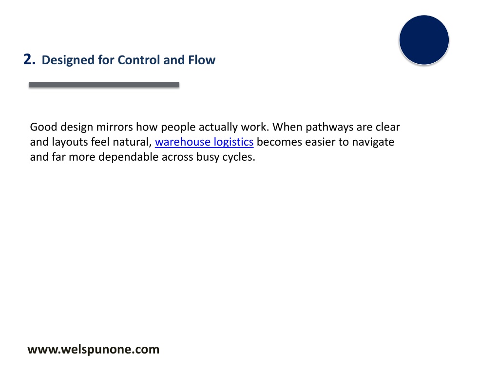 2.Designed for Control and Flow Good design mirrors how people actually work. When pathways are clear and layouts feel natural, warehouse logistics becomes easier to navigate and far more dependable across busy cycles. www.welspunone.com