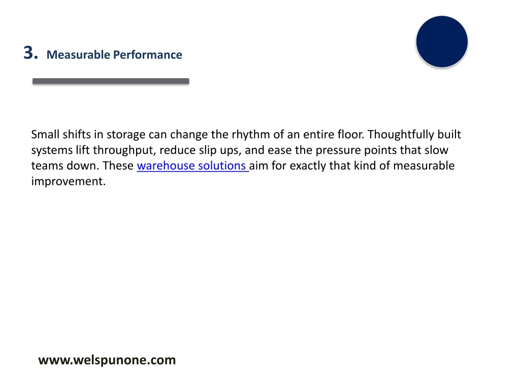 3.Measurable Performance Small shifts in storage can change the rhythm of an entire floor. Thoughtfully built systems lift throughput, reduce slip ups, and ease the pressure points that slow teams down. These warehouse solutions aim for exactly that kind of measurable improvement. www.welspunone.com