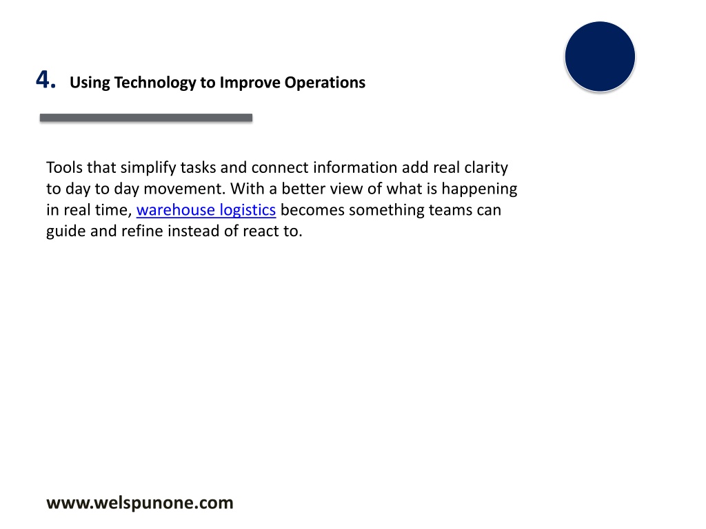 4. Using Technology to Improve Operations Tools that simplify tasks and connect information add real clarity to day to day movement. With a better view of what is happening in real time, warehouse logistics becomes something teams can guide and refine instead of react to. www.welspunone.com