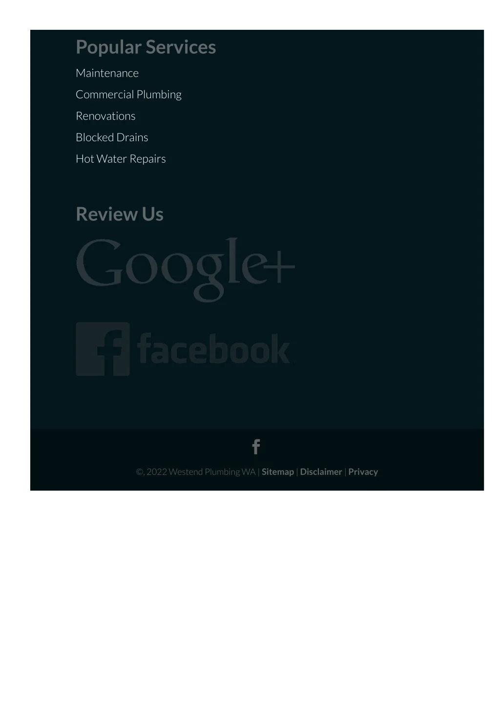 Popular Services Maintenance Commercial Plumbing Renovations Blocked Drains Hot Water Repairs Review Us ©, 2022 Westend Plumbing WA | Sitemap | Disclaimer | Privacy