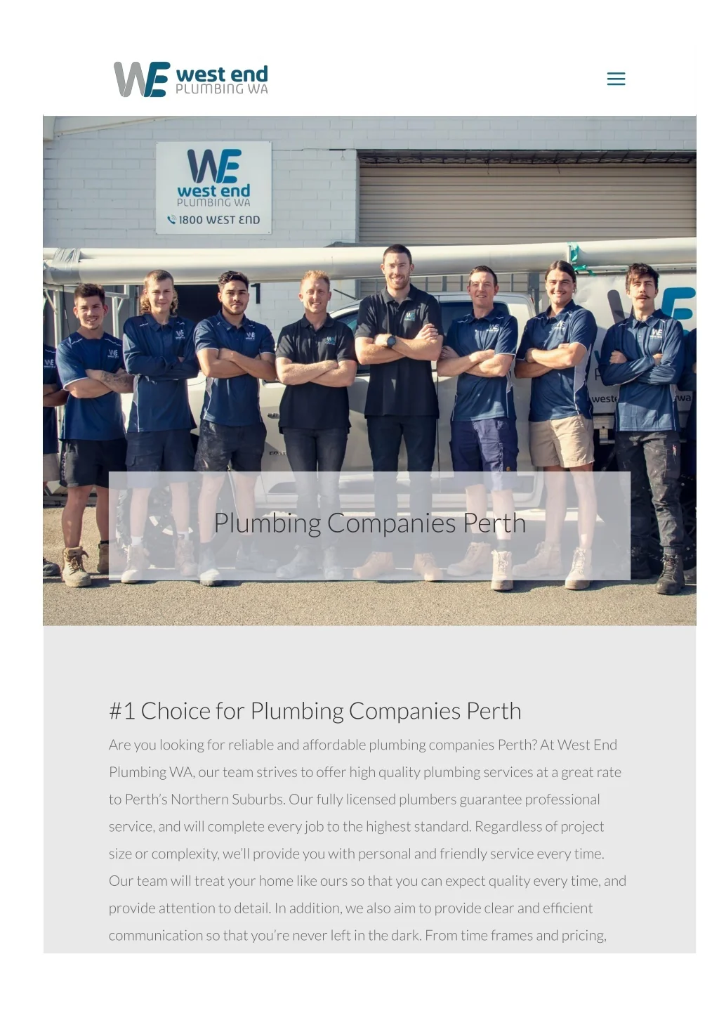 a Plumbing Companies Perth #1 Choice for Plumbing Companies Perth Are you looking for reliable and affordable plumbing companies Perth? At West End Plumbing WA, our team strives to offer high quality plumbing services at a great rate to Perth’s Northern Suburbs. Our fully licensed plumbers guarantee professional service, and will complete every job to the highest standard. Regardless of project size or complexity, we’ll provide you with personal and friendly service every time. Our team will treat your home like ours so that you can expect quality every time, and provide attention to detail. In addition, we also aim to provide clear and ef?cient communication so that you’re never left in the dark. From time frames and pricing,