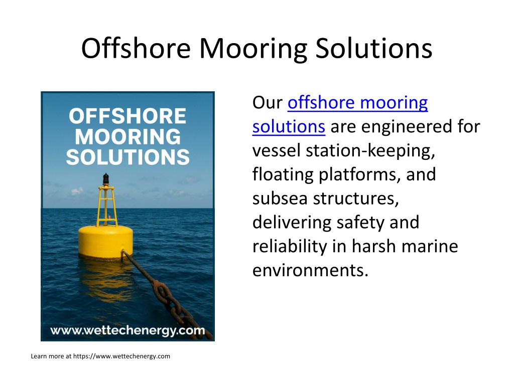 Offshore Mooring Solutions Our offshore mooring solutions are engineered for vessel station-keeping, floating platforms, and subsea structures, delivering safety and reliability in harsh marine environments. Learn more at https://www.wettechenergy.com
