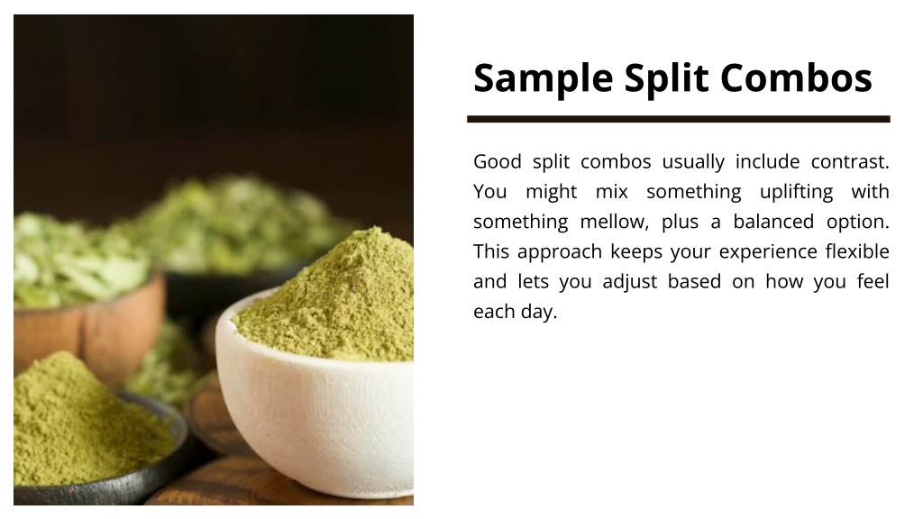 Sample Split Combos Good split combos usually include contrast. You might mix something uplifting with something mellow, plus a balanced option. This approach keeps your experience flexible and lets you adjust based on how you feel each day.