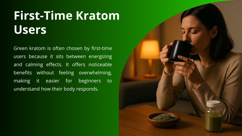 First-Time Kratom Users Green kratom is often chosen by first-time users because it sits between energizing and calming effects. It offers noticeable benefits without feeling overwhelming, making it easier understand how their body responds. for beginners to