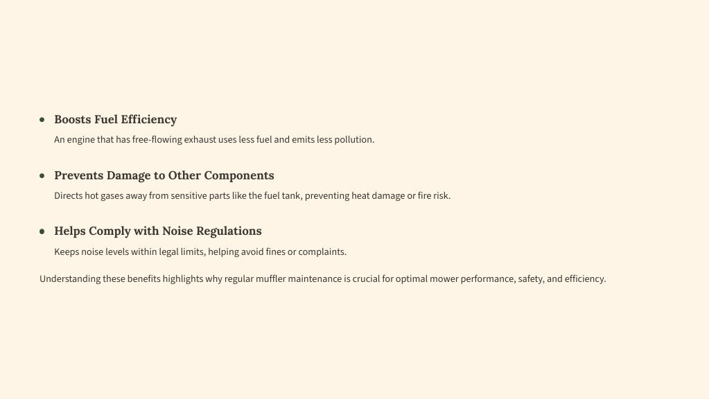 Boosts Fuel Efficiency An engine that has free-flowing exhaust uses less fuel and emits less pollution. Prevents Damage to Other Components Directs hot gases away from sensitive parts like the fuel tank, preventing heat damage or fire risk. Helps Comply with Noise Regulations Keeps noise levels within legal limits, helping avoid fines or complaints. Understanding these benefits highlights why regular muffler maintenance is crucial for optimal mower performance, safety, and efficiency.