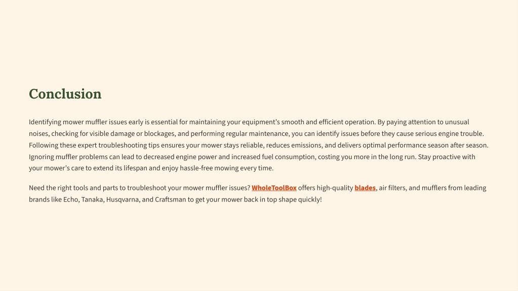 Conclusion Identifying mower muffler issues early is essential for maintaining your equipment9s smooth and efficient operation. By paying attention to unusual noises, checking for visible damage or blockages, and performing regular maintenance, you can identify issues before they cause serious engine trouble. Following these expert troubleshooting tips ensures your mower stays reliable, reduces emissions, and delivers optimal performance season after season. Ignoring muffler problems can lead to decreased engine power and increased fuel consumption, costing you more in the long run. Stay proactive with your mower9s care to extend its lifespan and enjoy hassle-free mowing every time. Need the right tools and parts to troubleshoot your mower muffler issues? WholeToolBox offers high-quality blades, air filters, and mufflers from leading brands like Echo, Tanaka, Husqvarna, and Craftsman to get your mower back in top shape quickly!