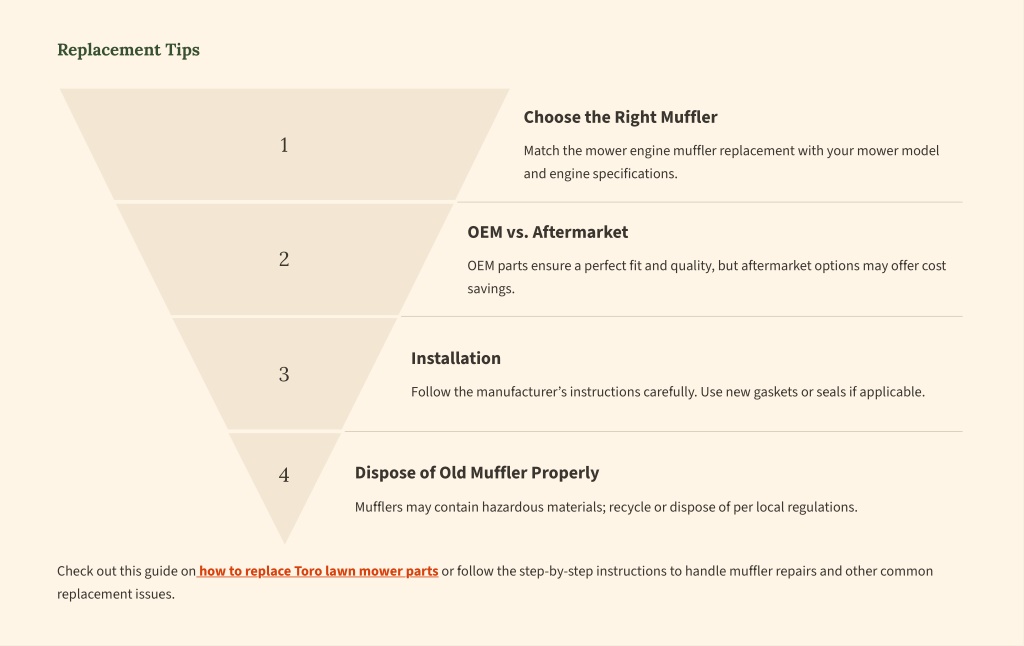 Replacement Tips Choose the Right Muffler 1 Match the mower engine muffler replacement with your mower model and engine specifications. OEM vs. Aftermarket 2 OEM parts ensure a perfect fit and quality, but aftermarket options may offer cost savings. Installation 3 Follow the manufacturer9s instructions carefully. Use new gaskets or seals if applicable. Dispose of Old Muffler Properly 4 Mufflers may contain hazardous materials; recycle or dispose of per local regulations. Check out this guide on how to replace Toro lawn mower parts or follow the step-by-step instructions to handle muffler repairs and other common replacement issues.