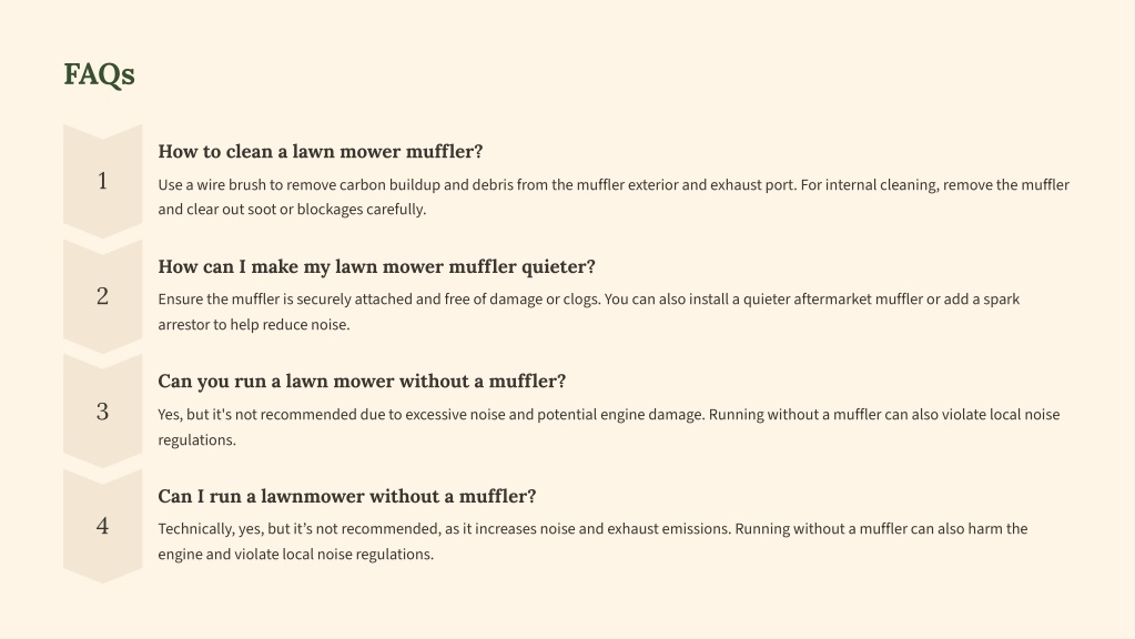 FAQs How to clean a lawn mower muffler? 1 Use a wire brush to remove carbon buildup and debris from the muffler exterior and exhaust port. For internal cleaning, remove the muffler and clear out soot or blockages carefully. How can I make my lawn mower muffler quieter? 2 Ensure the muffler is securely attached and free of damage or clogs. You can also install a quieter aftermarket muffler or add a spark arrestor to help reduce noise. Can you run a lawn mower without a muffler? 3 Yes, but it's not recommended due to excessive noise and potential engine damage. Running without a muffler can also violate local noise regulations. Can I run a lawnmower without a muffler? 4 Technically, yes, but it9s not recommended, as it increases noise and exhaust emissions. Running without a muffler can also harm the engine and violate local noise regulations.