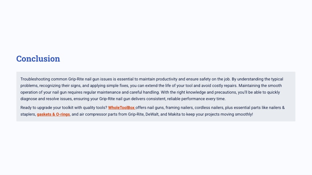 Conclusion Troubleshooting common Grip-Rite nail gun issues is essential to maintain productivity and ensure safety on the job. By understanding the typical problems, recognizing their signs, and applying simple fixes, you can extend the life of your tool and avoid costly repairs. Maintaining the smooth operation of your nail gun requires regular maintenance and careful handling. With the right knowledge and precautions, you’ll be able to quickly diagnose and resolve issues, ensuring your Grip-Rite nail gun delivers consistent, reliable performance every time. Ready to upgrade your toolkit with quality tools? WholeToolBox offers nail guns, framing nailers, cordless nailers, plus essential parts like nailers & staplers, gaskets & O-rings, and air compressor parts from Grip-Rite, DeWalt, and Makita to keep your projects moving smoothly!