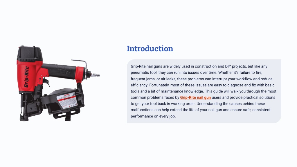Introduction Grip-Rite nail guns are widely used in construction and DIY projects, but like any pneumatic tool, they can run into issues over time. Whether it’s failure to fire, frequent jams, or air leaks, these problems can interrupt your workflow and reduce efficiency. Fortunately, most of these issues are easy to diagnose and fix with basic tools and a bit of maintenance knowledge. This guide will walk you through the most common problems faced by Grip-Rite nail gun users and provide practical solutions to get your tool back in working order. Understanding the causes behind these malfunctions can help extend the life of your nail gun and ensure safe, consistent performance on every job.