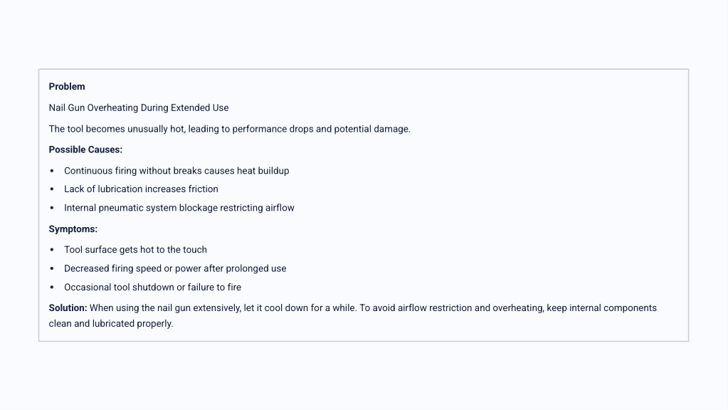 Problem Nail Gun Overheating During Extended Use The tool becomes unusually hot, leading to performance drops and potential damage. Possible Causes: Continuous firing without breaks causes heat buildup Lack of lubrication increases friction Internal pneumatic system blockage restricting airflow Symptoms: Tool surface gets hot to the touch Decreased firing speed or power after prolonged use Occasional tool shutdown or failure to fire Solution: When using the nail gun extensively, let it cool down for a while. To avoid airflow restriction and overheating, keep internal components clean and lubricated properly.