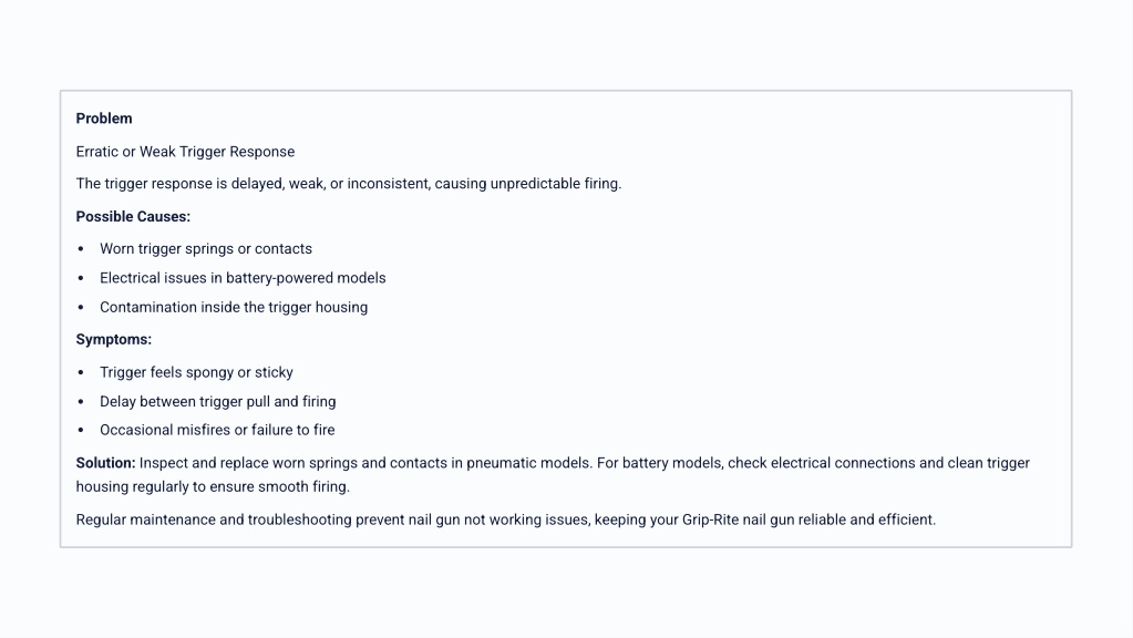 Problem Erratic or Weak Trigger Response The trigger response is delayed, weak, or inconsistent, causing unpredictable firing. Possible Causes: Worn trigger springs or contacts Electrical issues in battery-powered models Contamination inside the trigger housing Symptoms: Trigger feels spongy or sticky Delay between trigger pull and firing Occasional misfires or failure to fire Solution: Inspect and replace worn springs and contacts in pneumatic models. For battery models, check electrical connections and clean trigger housing regularly to ensure smooth firing. Regular maintenance and troubleshooting prevent nail gun not working issues, keeping your Grip-Rite nail gun reliable and efficient.