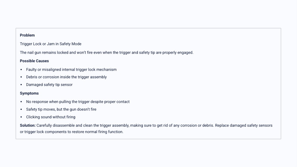 Problem Trigger Lock or Jam in Safety Mode The nail gun remains locked and won’t fire even when the trigger and safety tip are properly engaged. Possible Causes Faulty or misaligned internal trigger lock mechanism Debris or corrosion inside the trigger assembly Damaged safety tip sensor Symptoms No response when pulling the trigger despite proper contact Safety tip moves, but the gun doesn’t fire Clicking sound without firing Solution: Carefully disassemble and clean the trigger assembly, making sure to get rid of any corrosion or debris. Replace damaged safety sensors or trigger lock components to restore normal firing function.