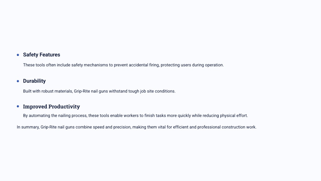 Understanding Your Specific Model and its Purpose is Essential for Effective Troubleshooting and Proper Maintenance Efficient Nailing Nail guns can drive nails rapidly, saving time and reducing fatigue compared to using a hammer. Consistent Results They ensure nails are driven to a uniform depth, which improves the quality and appearance of the finished project. Versatility Grip-Rite offers various models suitable for framing, finishing, roofing, and more, accommodating different nail sizes and types. Power Source Most Grip-Rite nail guns operate using compressed air (pneumatic), although some models are battery-powered or electric.