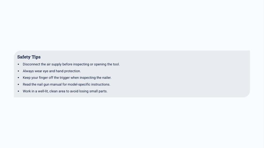 Safety Tips Disconnect the air supply before inspecting or opening the tool. Always wear eye and hand protection. Keep your finger off the trigger when inspecting the nailer. Read the nail gun manual for model-specific instructions. Work in a well-lit, clean area to avoid losing small parts.