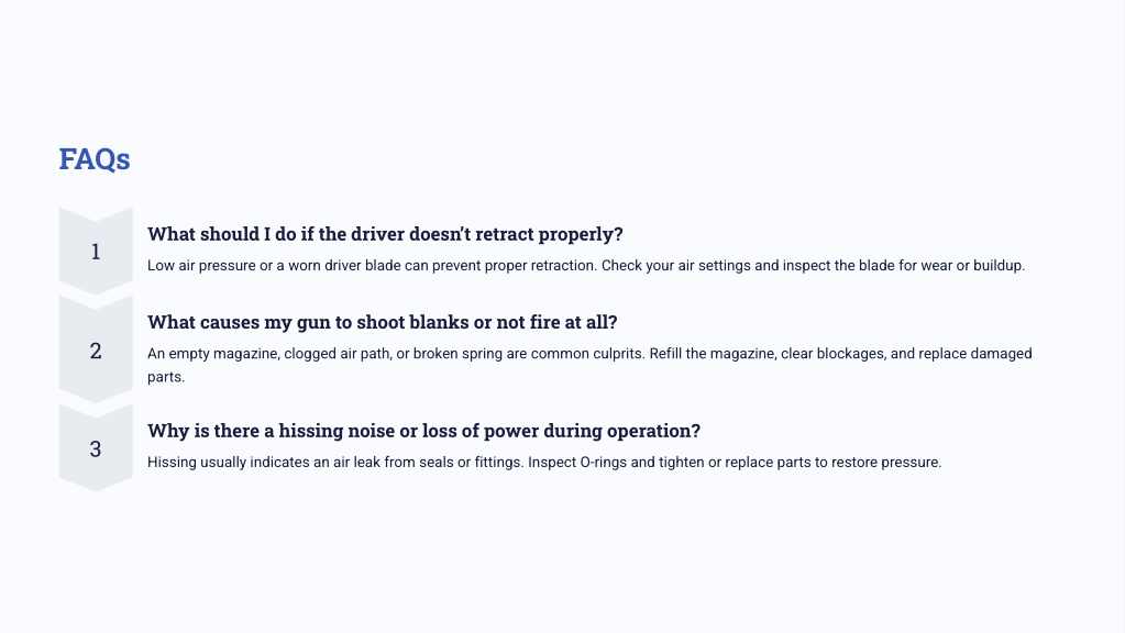 FAQs What should I do if the driver doesn’t retract properly? 1 Low air pressure or a worn driver blade can prevent proper retraction. Check your air settings and inspect the blade for wear or buildup. What causes my gun to shoot blanks or not fire at all? 2 An empty magazine, clogged air path, or broken spring are common culprits. Refill the magazine, clear blockages, and replace damaged parts. Why is there a hissing noise or loss of power during operation? 3 Hissing usually indicates an air leak from seals or fittings. Inspect O-rings and tighten or replace parts to restore pressure.