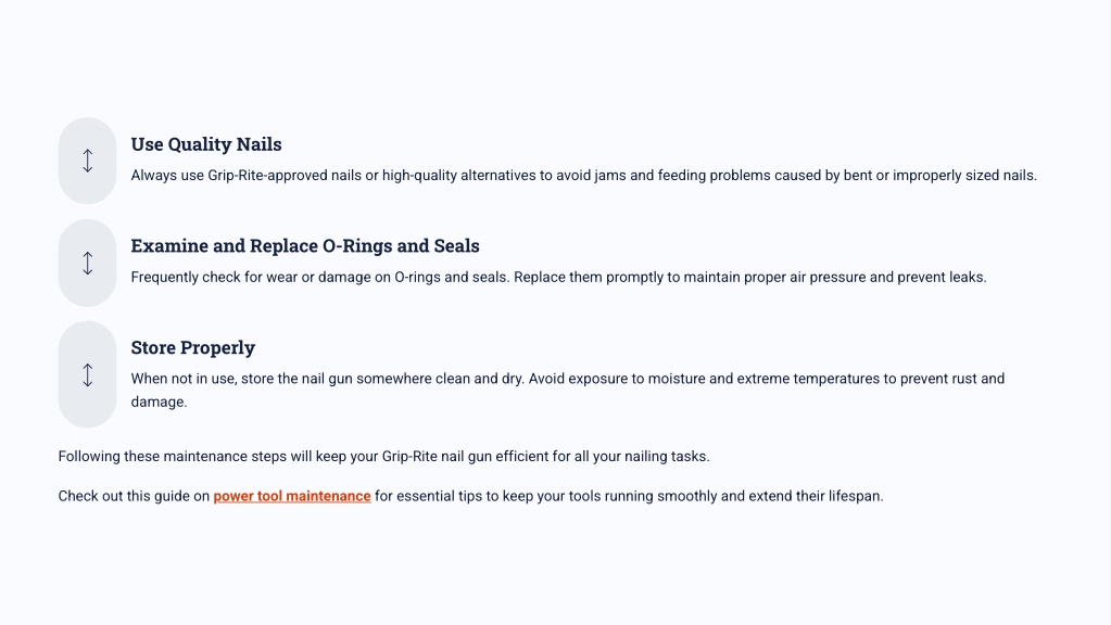 Use Quality Nails Always use Grip-Rite-approved nails or high-quality alternatives to avoid jams and feeding problems caused by bent or improperly sized nails. Examine and Replace O-Rings and Seals Frequently check for wear or damage on O-rings and seals. Replace them promptly to maintain proper air pressure and prevent leaks. Store Properly When not in use, store the nail gun somewhere clean and dry. Avoid exposure to moisture and extreme temperatures to prevent rust and damage. Following these maintenance steps will keep your Grip-Rite nail gun efficient for all your nailing tasks. Check out this guide on power tool maintenance for essential tips to keep your tools running smoothly and extend their lifespan.