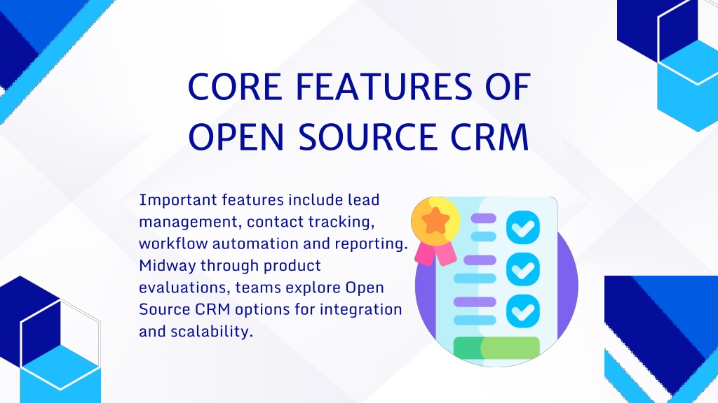 5. CORE FEATURES OF OPEN SOURCE CRM Important features include lead management, contact tracking, workflow automation and reporting. Midway through product evaluations, teams explore Open Source CRM options for integration and scalability.