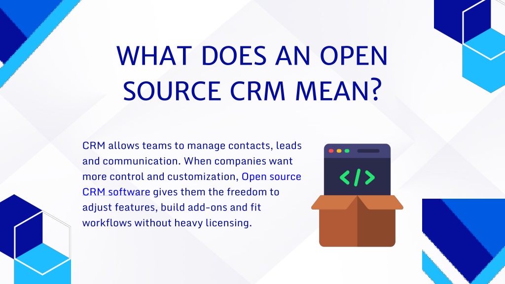 3. WHAT DOES AN OPEN SOURCE CRM MEAN? CRM allows teams to manage contacts, leads and communication. When companies want more control and customization, Open source CRM software gives them the freedom to adjust features, build add-ons and fit workflows without heavy licensing.