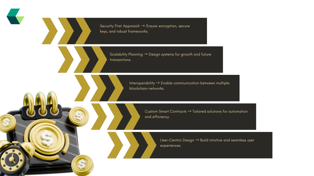 Security First Approach → Ensure encryption, secure keys, and robust frameworks. Scalability Planning → Design systems for growth and future transactions. Interoperability → Enable communication between multiple blockchain networks. Custom Smart Contracts → Tailored solutions for automation and efficiency. User-Centric Design → Build intuitive and seamless user experiences.