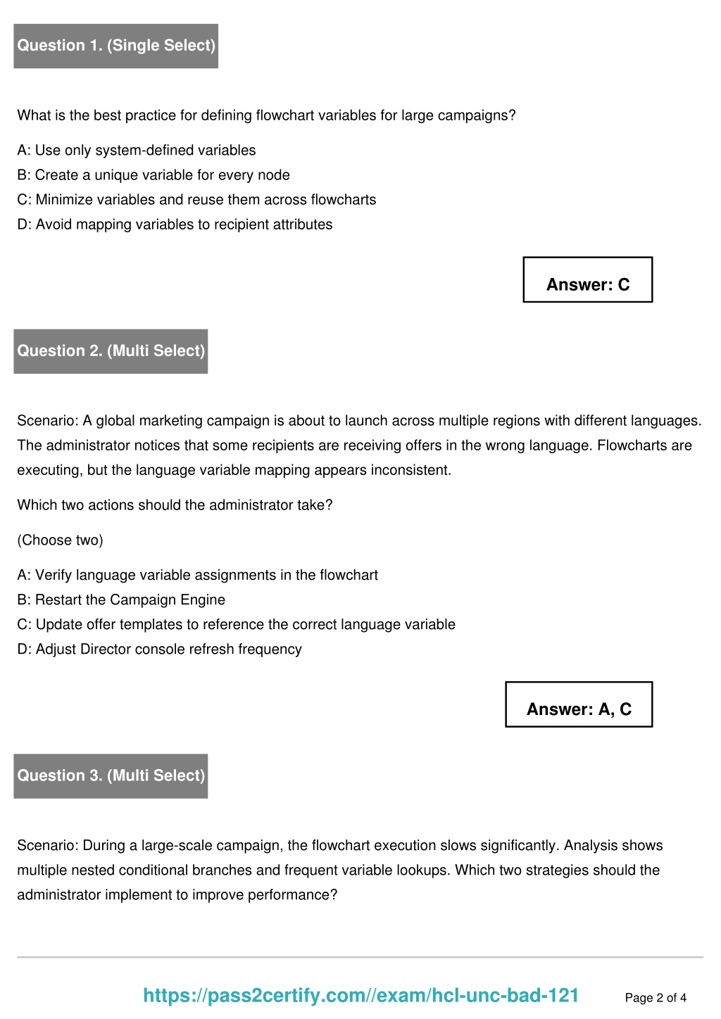 Question 1. (Single Select) What is the best practice for defining flowchart variables for large campaigns? A: Use only system-defined variables B: Create a unique variable for every node C: Minimize variables and reuse them across flowcharts D: Avoid mapping variables to recipient attributes Answer: C Question 2. (Multi Select) Scenario: A global marketing campaign is about to launch across multiple regions with different languages. The administrator notices that some recipients are receiving offers in the wrong language. Flowcharts are executing, but the language variable mapping appears inconsistent. Which two actions should the administrator take? (Choose two) A: Verify language variable assignments in the flowchart B: Restart the Campaign Engine C: Update offer templates to reference the correct language variable D: Adjust Director console refresh frequency Answer: A, C Question 3. (Multi Select) Scenario: During a large-scale campaign, the flowchart execution slows significantly. Analysis shows multiple nested conditional branches and frequent variable lookups. Which two strategies should the administrator implement to improve performance? https://pass2certify.com//exam/hcl-unc-bad-121 Page 2 of 4
