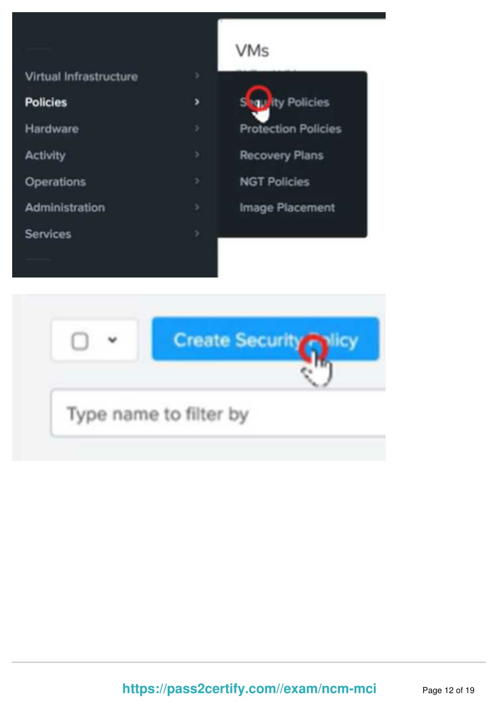 A: See the Explanation for step by step solution Answer: A Explanation: To configure the environment to satisfy the requirement of implementing a security policy named Staging_Production, such that no VM in the Staging Environment can communicate with any VM in the production Environment, you need to do the following steps: Log in to Prism Central and go to Network > Security Policies > Create Security Policy. Enter Staging_Production as the name of the security policy and select Cluster A as the cluster. In the Scope section, select VMs as the entity type and add the VMs that belong to the Staging Environment and the Production Environment as the entities. You can use tags or categories to filter the VMs based on their environment. In the Rules section, create a new rule with the following settings: Direction: Bidirectional Protocol: Any Source: Staging Environment Destination: Production Environment Action: Deny Save the security policy and apply it to the cluster. This will create a security policy that will block any traffic between the VMs in the Staging Environment and the VMs in the Production Environment. You can verify that the security policy is working by trying to ping or access any VM in the Production Environment from any VM in the Staging Environment, or vice vers a. You should not be able to do so. https://pass2certify.com//exam/ncm-mci Page 11 of 19