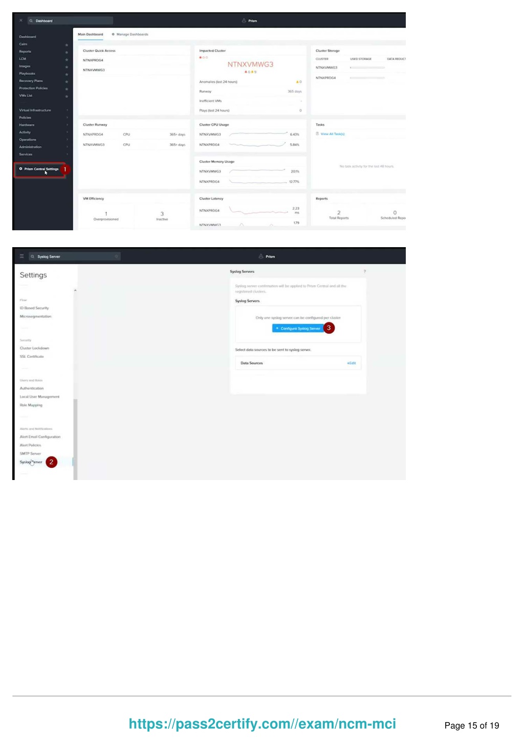 To configure the Nutanix clusters to enable audit logs for API Requests and replication capabilities, and push them to the syslog system with the highest reliability possible, you can follow these steps: Log in to the Nutanix Prism web console using your administrator credentials. Navigate to the "Settings" section or the configuration settings interface within Prism. Locate the "Syslog Configuration" or "Logging" option and click on it. Configure the syslog settings as follows: Syslog Name: Enter "Corp_syslog" as the name for the syslog configuration. Syslog IP: Set the IP address to "34.69.43.123", which is the IP address of the syslog system. Port: Set the port to "514", which is the default port for syslog. Enable the option for highest reliability or persistent logging, if available. This ensures that logs are sent reliably and not lost in case of network interruptions. Save the syslog configuration. Enable Audit Logs for API Requests: In the Nutanix Prism web console, navigate to the "Cluster" section or the cluster management interface. Select the desired cluster where you want to enable audit logs. Locate the "Audit Configuration" or "Security Configuration" option and click on it. Look for the settings related to audit logs and API requests. Enable the audit logging feature and select the top 4 severity levels to be logged. Save the audit configuration. Enable Audit Logs for Replication Capabilities: In the Nutanix Prism web console, navigate to the "Cluster" section or the cluster management interface. Select the desired cluster where you want to enable audit logs. Locate the "Audit Configuration" or "Security Configuration" option and click on it. Look for the settings related to audit logs and replication capabilities. Enable the audit logging feature and select the top 4 severity levels to be logged. Save the audit configuration. After completing these steps, the Nutanix https://pass2certify.com//exam/ncm-mci Page 17 of 19