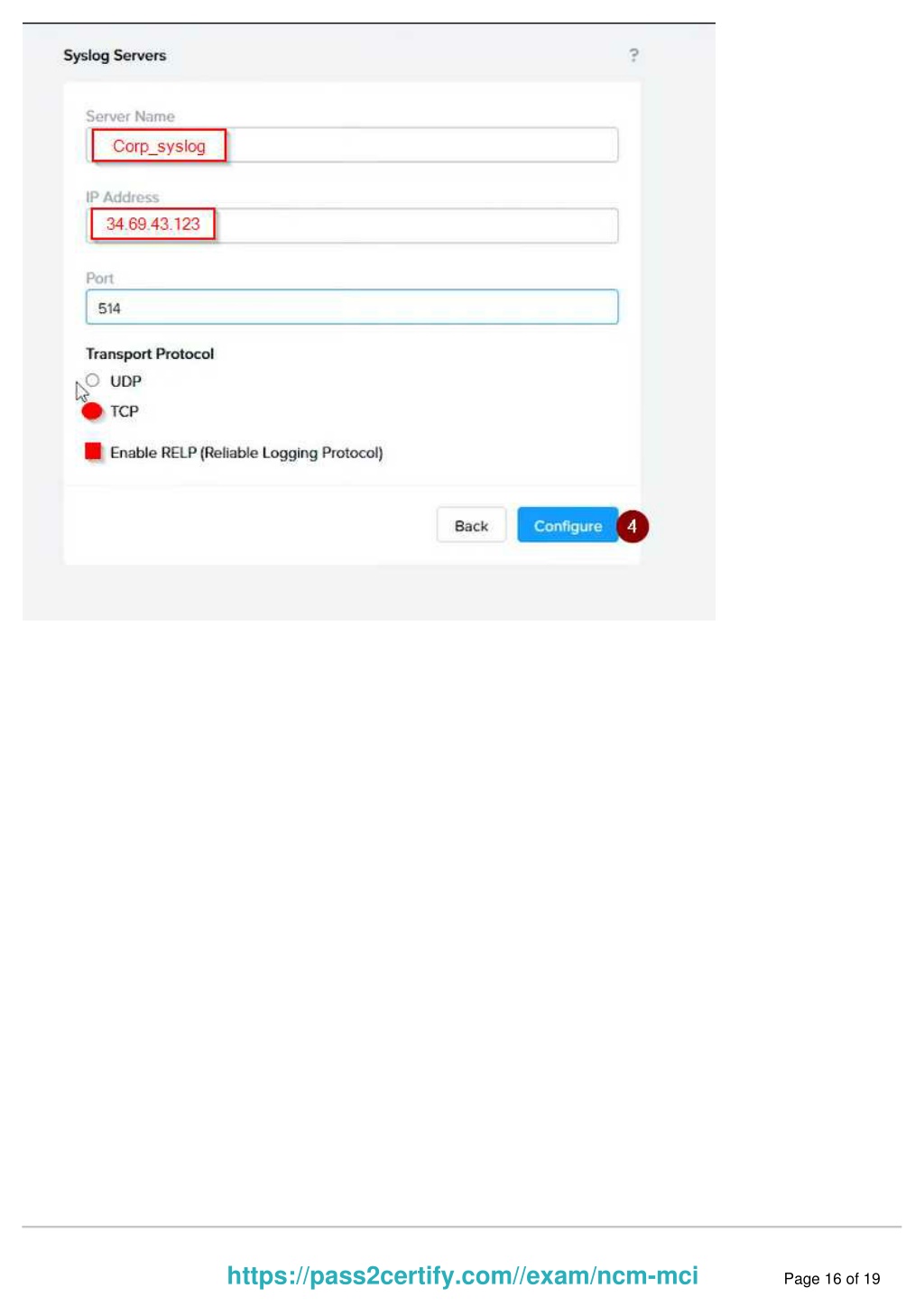 Depending on the order you perform the exam items, the access information and credentials could change. Please refer to the other item performed on Cluster B if you have problems accessing the cluster. The infosec team has requested that audit logs for API Requests and replication capabilities be enabled for all clusters for the top 4 severity levels and pushed to their syslog system using highest reliability possible. They have requested no other logs to be included. Syslog configuration: Syslog Name: Corp_syslog Syslop IP: 34.69.43.123 Port: 514 Ensure the cluster is configured to meet these requirements. A: See the Explanation for step by step solution Answer: A Explanation: To configure the cluster to meet the requirements of the infosec team, you need to do the following steps: Log in to Prism Central and go to Network > Syslog Servers > Configure Syslog Server. Enter Corp_syslog as the Server Name, 34.69.43.123 as the IP Address, and 514 as the Port. Select TCP as the Transport Protocol and enable RELP (Reliable Logging Protocol). This will create a syslog server with the highest reliability possible. Click Edit against Data Sources and select Cluster B as the cluster. Select API Requests and Replication as the data sources and set the log level to CRITICAL for both of them. This will enable audit logs for API requests and replication capabilities for the top 4 severity levels (EMERGENCY, ALERT, CRITICAL, and ERROR) and push them to the syslog server. Click Save. Repeat step 2 for any other clusters that you want to configure with the same requirements. https://pass2certify.com//exam/ncm-mci Page 14 of 19
