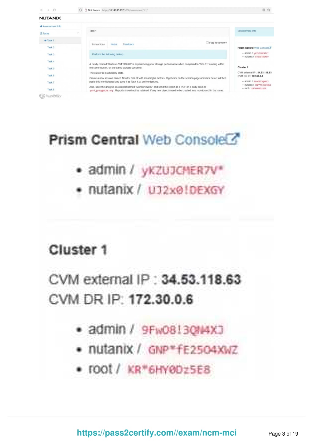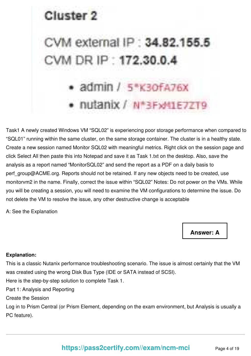 Task1 A newly created Windows VM “SQL02” is experiencing poor storage performance when compared to “SQL01” running within the same cluster, on the same storage container. The cluster is in a healthy state. Create a new session named Monitor SQL02 with meaningful metrics. Right click on the session page and click Select All then paste this into Notepad and save it as Task 1.txt on the desktop. Also, save the analysis as a report named “MonitorSQL02” and send the report as a PDF on a daily basis to perf_group@ACME.org. Reports should not be retained. If any new objects need to be created, use monitorvm2 in the name. Finally, correct the issue within “SQL02” Notes: Do not power on the VMs. While you will be creating a session, you will need to examine the VM configurations to determine the issue. Do not delete the VM to resolve the issue, any other destructive change is acceptable A: See the Explanation Answer: A Explanation: This is a classic Nutanix performance troubleshooting scenario. The issue is almost certainly that the VM was created using the wrong Disk Bus Type (IDE or SATA instead of SCSI). Here is the step-by-step solution to complete Task 1. Part 1: Analysis and Reporting Create the Session Log in to Prism Central (or Prism Element, depending on the exam environment, but Analysis is usually a PC feature). https://pass2certify.com//exam/ncm-mci Page 4 of 19