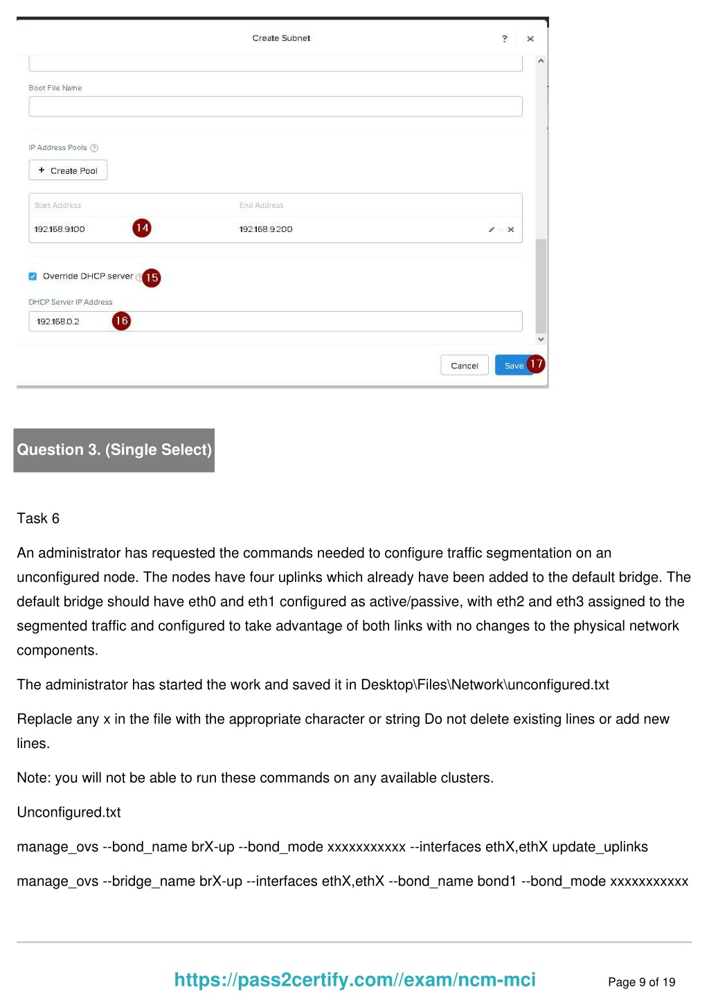 Question 3. (Single Select) Task 6 An administrator has requested the commands needed to configure traffic segmentation on an unconfigured node. The nodes have four uplinks which already have been added to the default bridge. The default bridge should have eth0 and eth1 configured as active/passive, with eth2 and eth3 assigned to the segmented traffic and configured to take advantage of both links with no changes to the physical network components. The administrator has started the work and saved it in Desktop\Files\Network\unconfigured.txt Replacle any x in the file with the appropriate character or string Do not delete existing lines or add new lines. Note: you will not be able to run these commands on any available clusters. Unconfigured.txt manage_ovs --bond_name brX-up --bond_mode xxxxxxxxxxx --interfaces ethX,ethX update_uplinks manage_ovs --bridge_name brX-up --interfaces ethX,ethX --bond_name bond1 --bond_mode xxxxxxxxxxx https://pass2certify.com//exam/ncm-mci Page 9 of 19