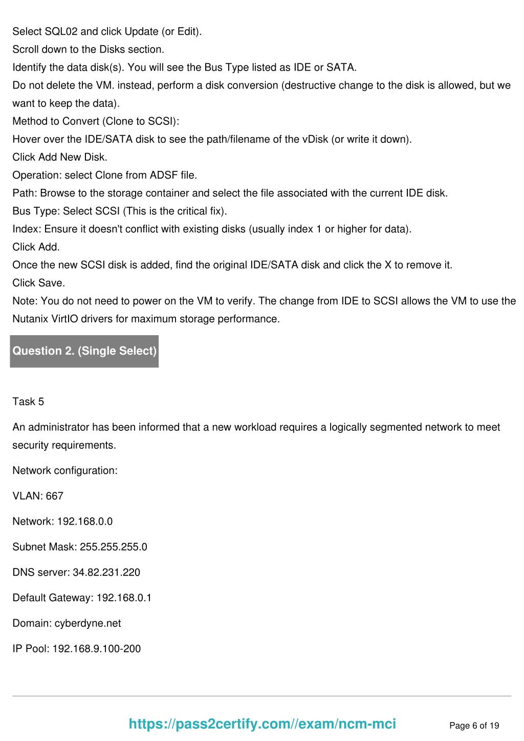 Select SQL02 and click Update (or Edit). Scroll down to the Disks section. Identify the data disk(s). You will see the Bus Type listed as IDE or SATA. Do not delete the VM. instead, perform a disk conversion (destructive change to the disk is allowed, but we want to keep the data). Method to Convert (Clone to SCSI): Hover over the IDE/SATA disk to see the path/filename of the vDisk (or write it down). Click Add New Disk. Operation: select Clone from ADSF file. Path: Browse to the storage container and select the file associated with the current IDE disk. Bus Type: Select SCSI (This is the critical fix). Index: Ensure it doesn't conflict with existing disks (usually index 1 or higher for data). Click Add. Once the new SCSI disk is added, find the original IDE/SATA disk and click the X to remove it. Click Save. Note: You do not need to power on the VM to verify. The change from IDE to SCSI allows the VM to use the Nutanix VirtIO drivers for maximum storage performance. Question 2. (Single Select) Task 5 An administrator has been informed that a new workload requires a logically segmented network to meet security requirements. Network configuration: VLAN: 667 Network: 192.168.0.0 Subnet Mask: 255.255.255.0 DNS server: 34.82.231.220 Default Gateway: 192.168.0.1 Domain: cyberdyne.net IP Pool: 192.168.9.100-200 https://pass2certify.com//exam/ncm-mci Page 6 of 19