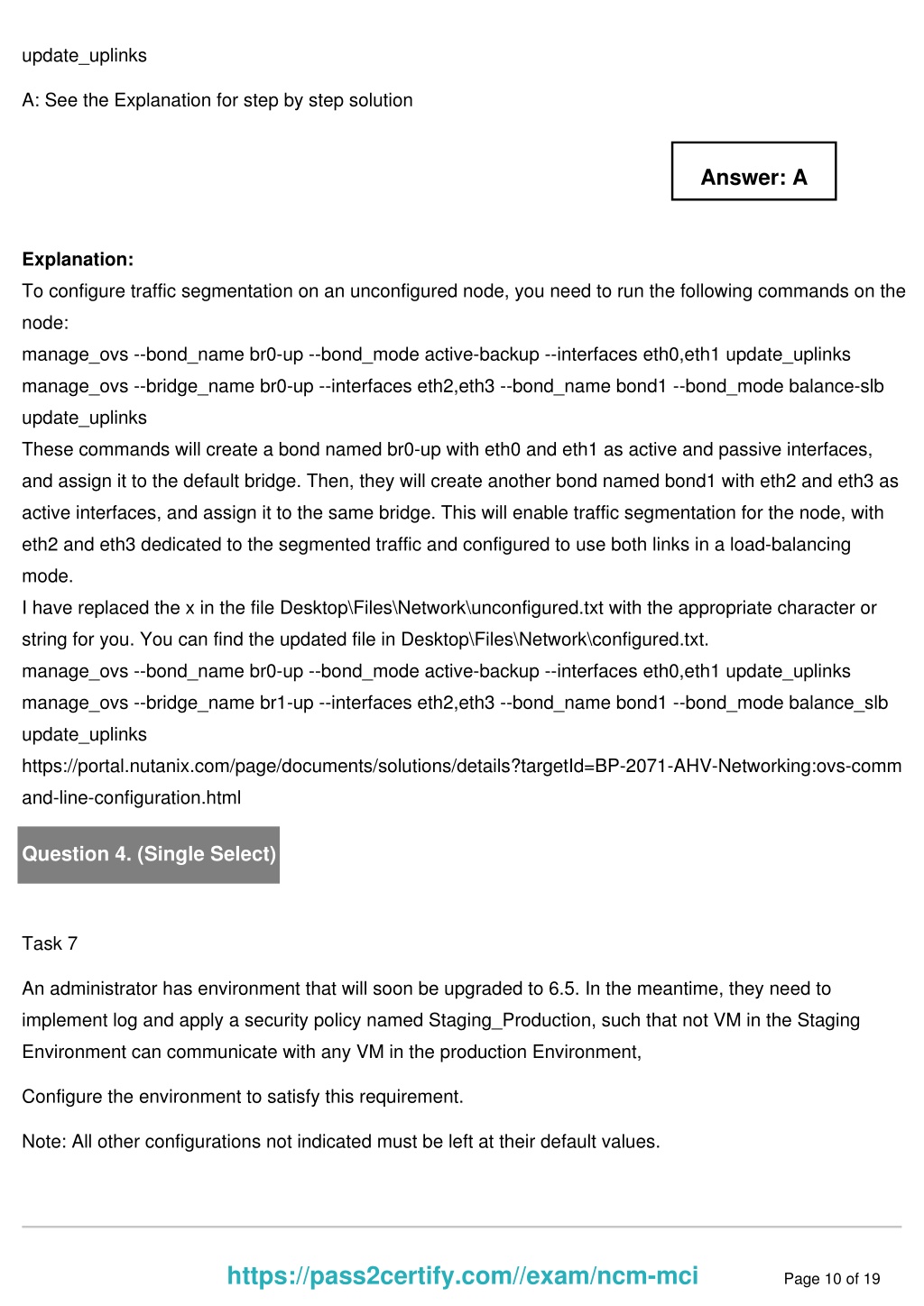 update_uplinks A: See the Explanation for step by step solution Answer: A Explanation: To configure traffic segmentation on an unconfigured node, you need to run the following commands on the node: manage_ovs --bond_name br0-up --bond_mode active-backup --interfaces eth0,eth1 update_uplinks manage_ovs --bridge_name br0-up --interfaces eth2,eth3 --bond_name bond1 --bond_mode balance-slb update_uplinks These commands will create a bond named br0-up with eth0 and eth1 as active and passive interfaces, and assign it to the default bridge. Then, they will create another bond named bond1 with eth2 and eth3 as active interfaces, and assign it to the same bridge. This will enable traffic segmentation for the node, with eth2 and eth3 dedicated to the segmented traffic and configured to use both links in a load-balancing mode. I have replaced the x in the file Desktop\Files\Network\unconfigured.txt with the appropriate character or string for you. You can find the updated file in Desktop\Files\Network\configured.txt. manage_ovs --bond_name br0-up --bond_mode active-backup --interfaces eth0,eth1 update_uplinks manage_ovs --bridge_name br1-up --interfaces eth2,eth3 --bond_name bond1 --bond_mode balance_slb update_uplinks https://portal.nutanix.com/page/documents/solutions/details?targetId=BP-2071-AHV-Networking:ovs-comm and-line-configuration.html Question 4. (Single Select) Task 7 An administrator has environment that will soon be upgraded to 6.5. In the meantime, they need to implement log and apply a security policy named Staging_Production, such that not VM in the Staging Environment can communicate with any VM in the production Environment, Configure the environment to satisfy this requirement. Note: All other configurations not indicated must be left at their default values. https://pass2certify.com//exam/ncm-mci Page 10 of 19