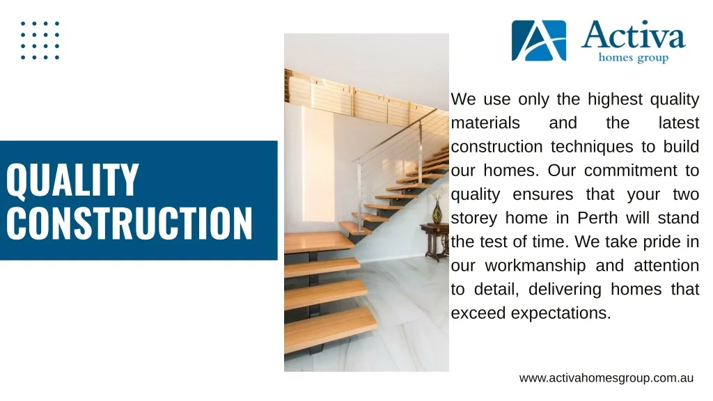 About Service Team Contact We use only the highest quality materials and the latest construction techniques to build our homes. Our commitment to quality ensures that your two storey home in Perth will stand the test of time. We take pride in our workmanship and attention to detail, delivering homes that exceed expectations. QUALITY CONSTRUCTION www.activahomesgroup.com.au