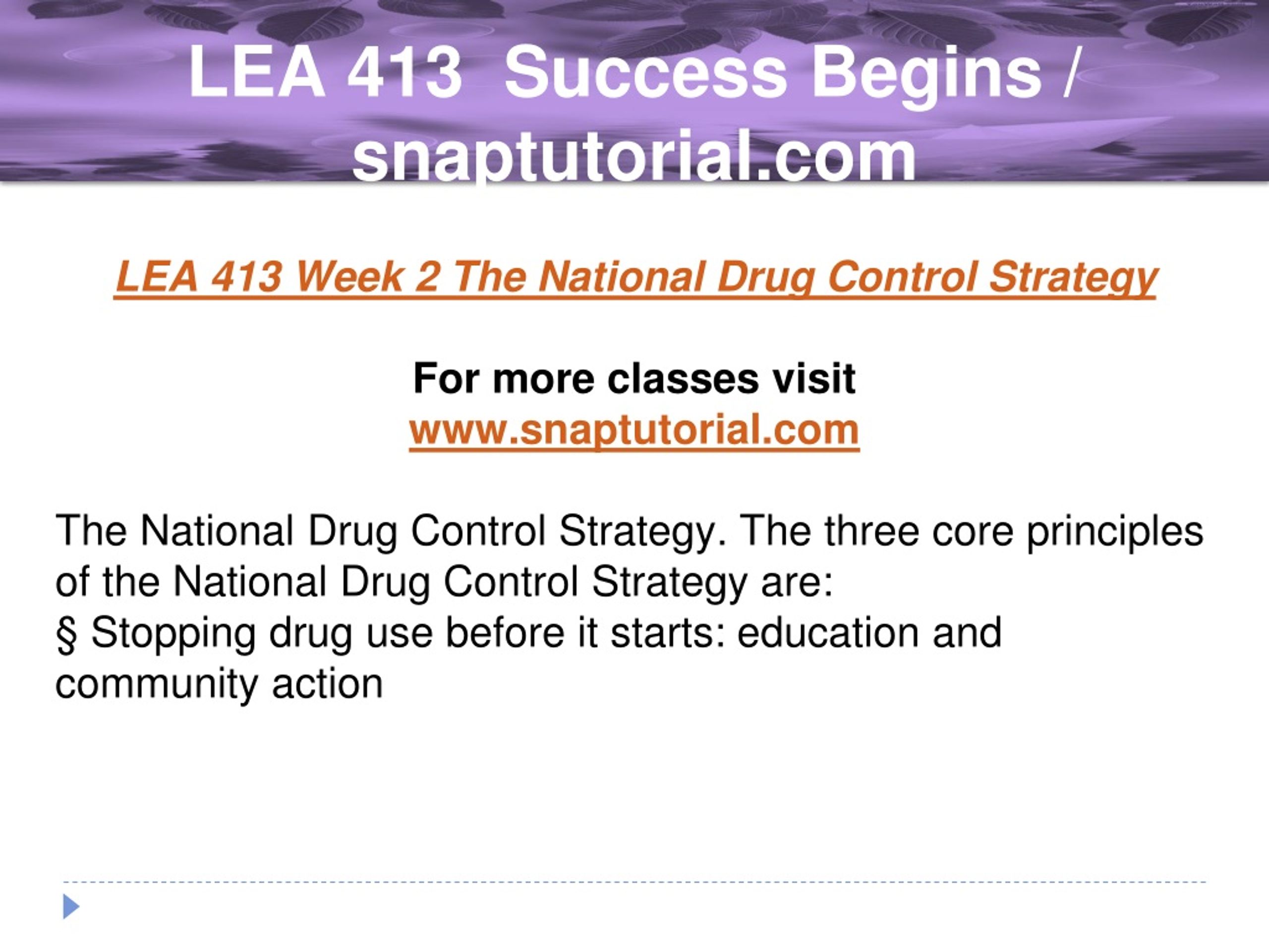 LEA 413 Success Begins / snaptutorial.com LEA 413 Week 2 The National Drug Control Strategy For more classes visit www.snaptutorial.com The National Drug Control Strategy. The three core principles of the National Drug Control Strategy are: § Stopping drug use before it starts: education and community action