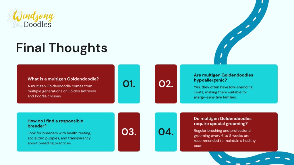 3. Final Thoughts Are multigen Goldendoodles hypoallergenic? What is a multigen Goldendoodle? 01. 02. A multigen Goldendoodle comes from multiple generations of Golden Retriever and Poodle crosses. Yes, they often have low-shedding coats, making them suitable for allergy-sensitive families. Do multigen Goldendoodles require special grooming? Regular brushing and professional grooming every 6 to 8 weeks are recommended to maintain a healthy coat. How do I find a responsible breeder? 03. 04. Look for breeders with health testing, socialized puppies, and transparency about breeding practices.