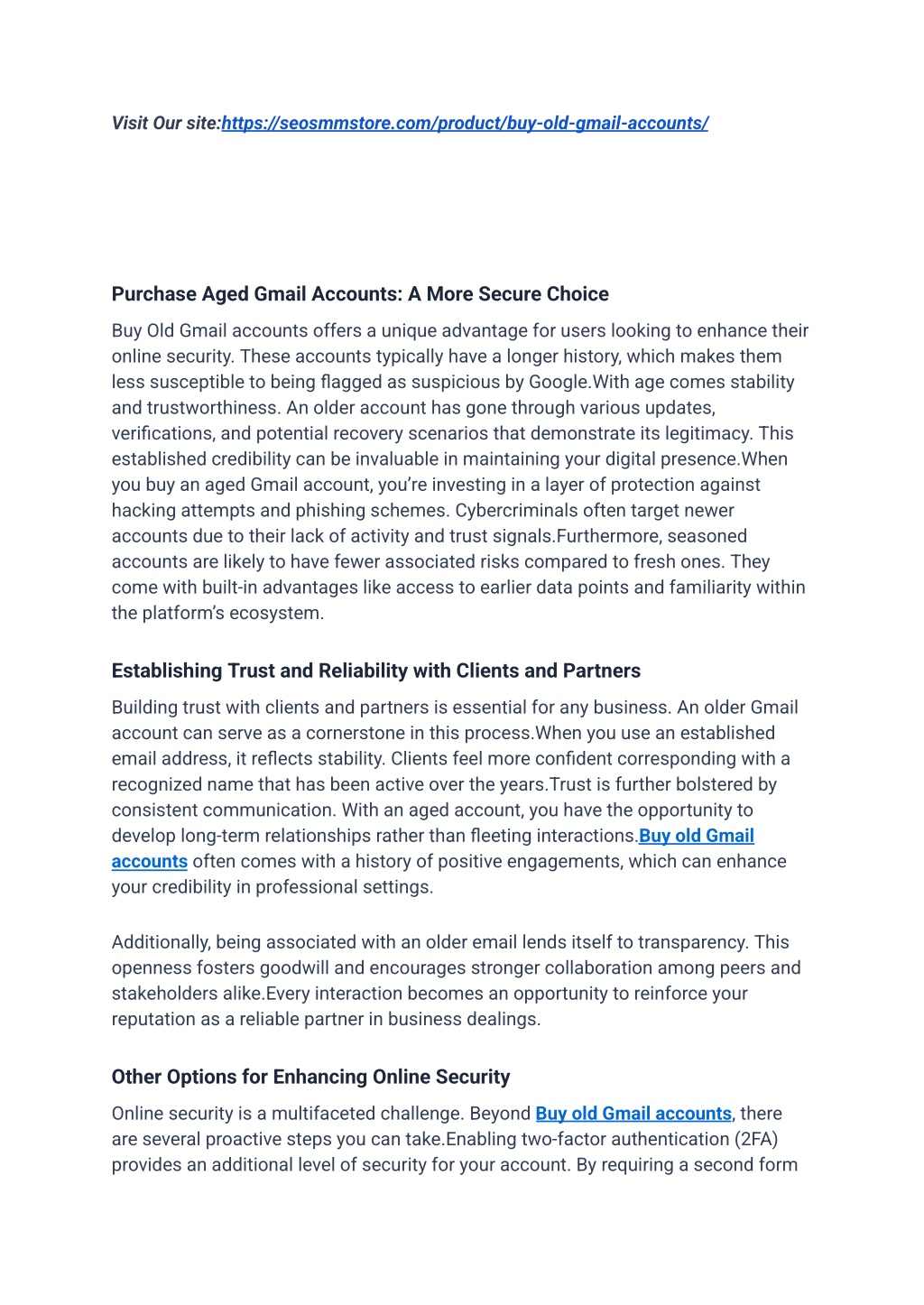 Visit Our site:https://seosmmstore.com/product/buy-old-gmail-accounts/ Purchase Aged Gmail Accounts: A More Secure Choice Buy Old Gmail accounts offers a unique advantage for users looking to enhance their online security. These accounts typically have a longer history, which makes them less susceptible to being flagged as suspicious by Google.With age comes stability and trustworthiness. An older account has gone through various updates, verifications, and potential recovery scenarios that demonstrate its legitimacy. This established credibility can be invaluable in maintaining your digital presence.When you buy an aged Gmail account, you’re investing in a layer of protection against hacking attempts and phishing schemes. Cybercriminals often target newer accounts due to their lack of activity and trust signals.Furthermore, seasoned accounts are likely to have fewer associated risks compared to fresh ones. They come with built-in advantages like access to earlier data points and familiarity within the platform’s ecosystem. Establishing Trust and Reliability with Clients and Partners Building trust with clients and partners is essential for any business. An older Gmail account can serve as a cornerstone in this process.When you use an established email address, it reflects stability. Clients feel more confident corresponding with a recognized name that has been active over the years.Trust is further bolstered by consistent communication. With an aged account, you have the opportunity to develop long-term relationships rather than fleeting interactions.Buy old Gmail accounts often comes with a history of positive engagements, which can enhance your credibility in professional settings. Additionally, being associated with an older email lends itself to transparency. This openness fosters goodwill and encourages stronger collaboration among peers and stakeholders alike.Every interaction becomes an opportunity to reinforce your reputation as a reliable partner in business dealings. Other Options for Enhancing Online Security Online security is a multifaceted challenge. Beyond Buy old Gmail accounts, there are several proactive steps you can take.Enabling two-factor authentication (2FA) provides an additional level of security for your account. By requiring a second form
