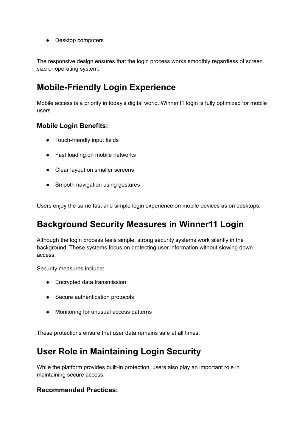 ● Desktop computers The responsive design ensures that the login process works smoothly regardless of screen size or operating system. Mobile-Friendly Login Experience Mobile access is a priority in today’s digital world. Winner11 login is fully optimized for mobile users. Mobile Login Benefits: ● Touch-friendly input fields ● Fast loading on mobile networks ● Clear layout on smaller screens ● Smooth navigation using gestures Users enjoy the same fast and simple login experience on mobile devices as on desktops. Background Security Measures in Winner11 Login Although the login process feels simple, strong security systems work silently in the background. These systems focus on protecting user information without slowing down access. Security measures include: ● Encrypted data transmission ● Secure authentication protocols ● Monitoring for unusual access patterns These protections ensure that user data remains safe at all times. User Role in Maintaining Login Security While the platform provides built-in protection, users also play an important role in maintaining secure access. Recommended Practices: