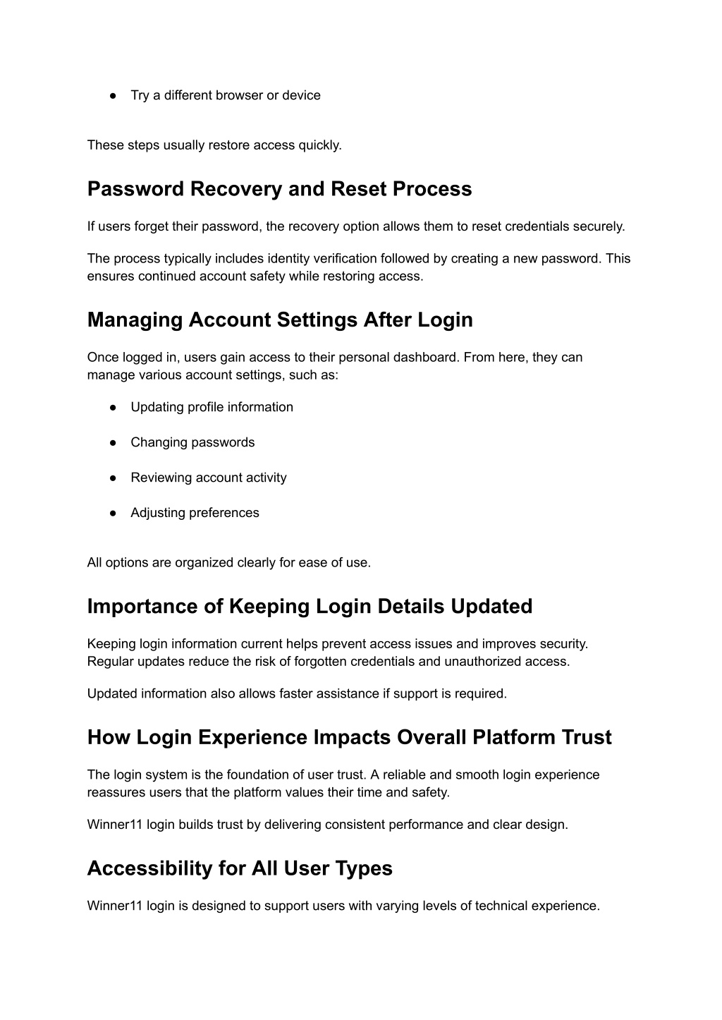 ● Try a different browser or device These steps usually restore access quickly. Password Recovery and Reset Process If users forget their password, the recovery option allows them to reset credentials securely. The process typically includes identity verification followed by creating a new password. This ensures continued account safety while restoring access. Managing Account Settings After Login Once logged in, users gain access to their personal dashboard. From here, they can manage various account settings, such as: ● Updating profile information ● Changing passwords ● Reviewing account activity ● Adjusting preferences All options are organized clearly for ease of use. Importance of Keeping Login Details Updated Keeping login information current helps prevent access issues and improves security. Regular updates reduce the risk of forgotten credentials and unauthorized access. Updated information also allows faster assistance if support is required. How Login Experience Impacts Overall Platform Trust The login system is the foundation of user trust. A reliable and smooth login experience reassures users that the platform values their time and safety. Winner11 login builds trust by delivering consistent performance and clear design. Accessibility for All User Types Winner11 login is designed to support users with varying levels of technical experience.