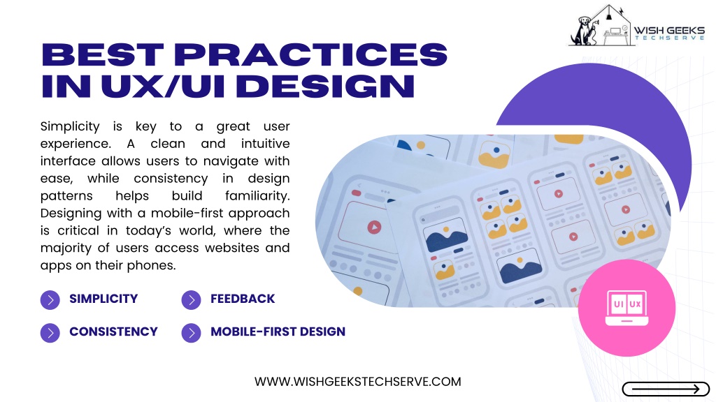Best Practices in UX/UI Design Simplicity is key to a great user experience. A clean and intuitive interface allows users to navigate with ease, while consistency in design patterns helps build familiarity. Designing with a mobile-first approach is critical in today’s world, where the majority of users access websites and apps on their phones. SIMPLICITY FEEDBACK CONSISTENCY MOBILE-FIRST DESIGN WWW.WISHGEEKSTECHSERVE.COM