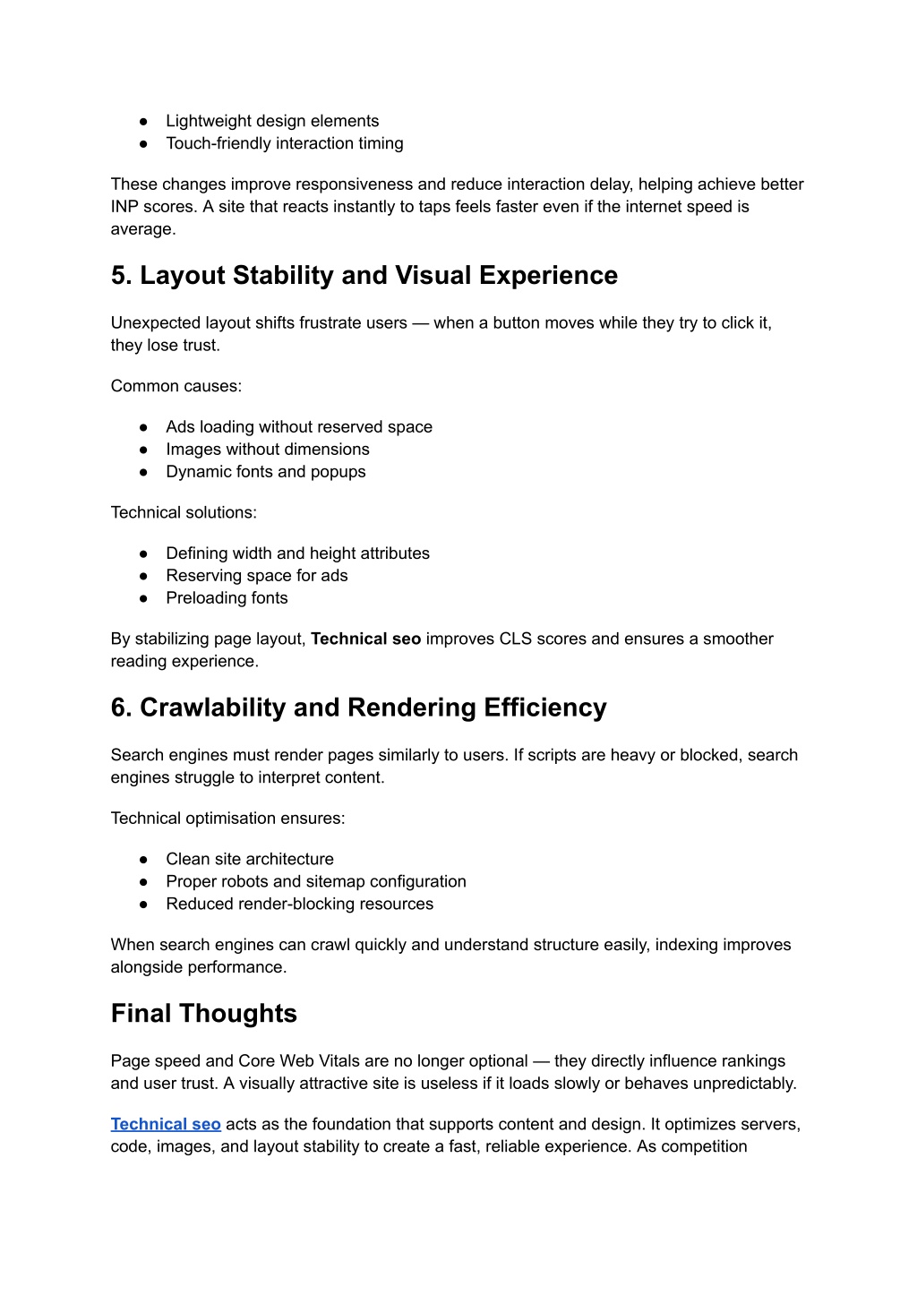 ● Lightweight design elements ● Touch-friendly interaction timing These changes improve responsiveness and reduce interaction delay, helping achieve better INP scores. A site that reacts instantly to taps feels faster even if the internet speed is average. 5. Layout Stability and Visual Experience Unexpected layout shifts frustrate users — when a button moves while they try to click it, they lose trust. Common causes: ● Ads loading without reserved space ● Images without dimensions ● Dynamic fonts and popups Technical solutions: ● Defining width and height attributes ● Reserving space for ads ● Preloading fonts By stabilizing page layout, Technical seo improves CLS scores and ensures a smoother reading experience. 6. Crawlability and Rendering Efficiency Search engines must render pages similarly to users. If scripts are heavy or blocked, search engines struggle to interpret content. Technical optimisation ensures: ● Clean site architecture ● Proper robots and sitemap configuration ● Reduced render-blocking resources When search engines can crawl quickly and understand structure easily, indexing improves alongside performance. Final Thoughts Page speed and Core Web Vitals are no longer optional — they directly influence rankings and user trust. A visually attractive site is useless if it loads slowly or behaves unpredictably. Technical seo acts as the foundation that supports content and design. It optimizes servers, code, images, and layout stability to create a fast, reliable experience. As competition