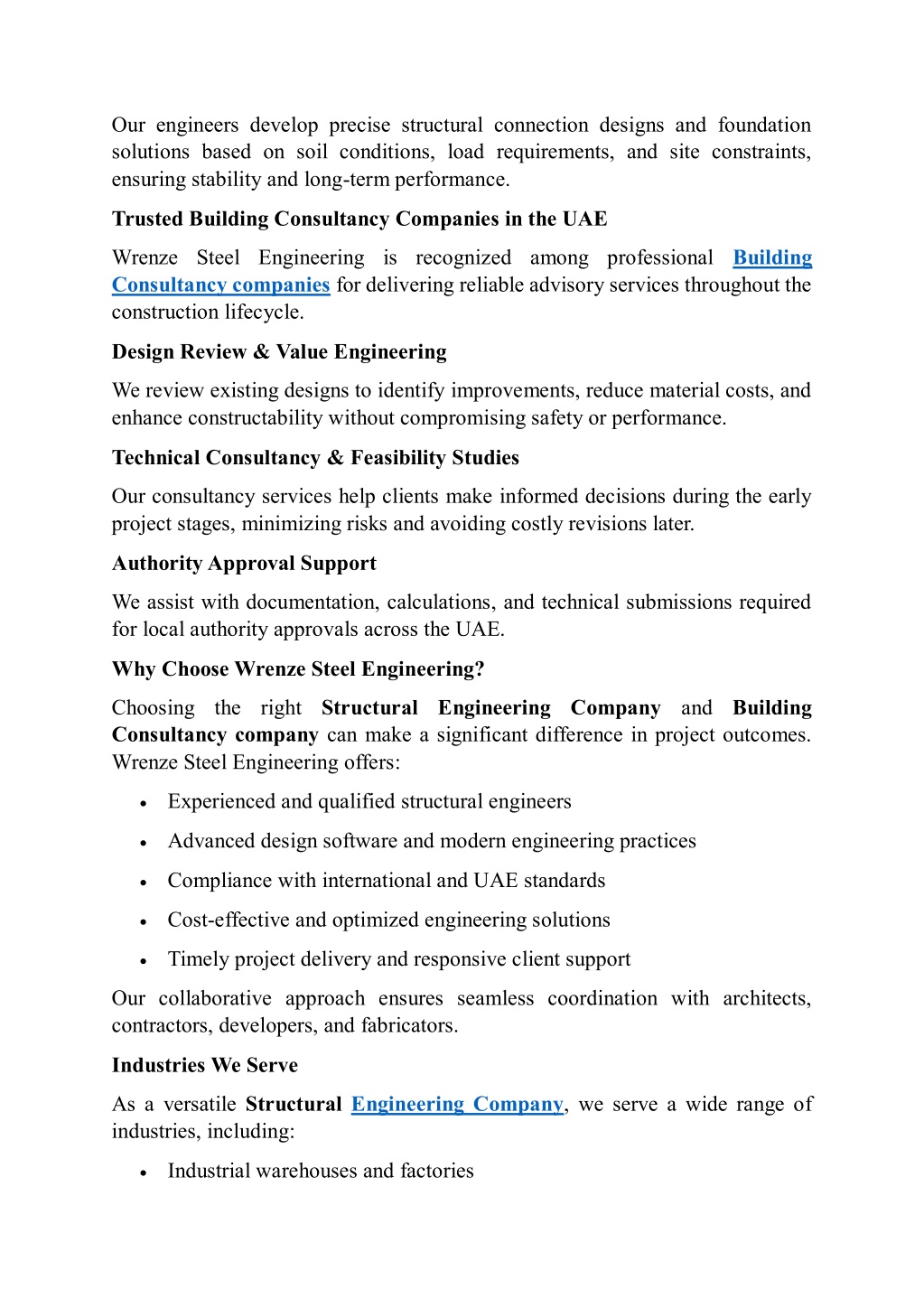 2. Our engineers develop precise structural connection designs and foundation solutions based on soil conditions, load requirements, and site constraints, ensuring stability and long-term performance. Trusted Building Consultancy Companies in the UAE Wrenze Steel Engineering is recognized among professional Building Consultancy companies for delivering reliable advisory services throughout the construction lifecycle. Design Review & Value Engineering We review existing designs to identify improvements, reduce material costs, and enhance constructability without compromising safety or performance. Technical Consultancy & Feasibility Studies Our consultancy services help clients make informed decisions during the early project stages, minimizing risks and avoiding costly revisions later. Authority Approval Support We assist with documentation, calculations, and technical submissions required for local authority approvals across the UAE. Why Choose Wrenze Steel Engineering? Choosing the right Structural Engineering Company and Building Consultancy company can make a significant difference in project outcomes. Wrenze Steel Engineering offers: Experienced and qualified structural engineers Advanced design software and modern engineering practices Compliance with international and UAE standards Cost-effective and optimized engineering solutions Timely project delivery and responsive client support Our collaborative approach ensures seamless coordination with architects, contractors, developers, and fabricators. Industries We Serve As a versatile Structural Engineering Company, we serve a wide range of industries, including: Industrial warehouses and factories
