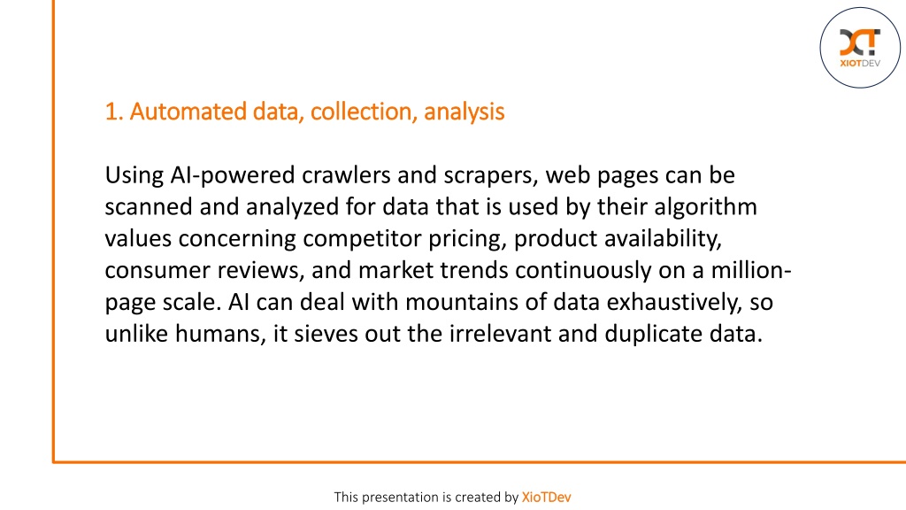 1. Automated data, collection, analysis Using AI-powered crawlers and scrapers, web pages can be scanned and analyzed for data that is used by their algorithm values concerning competitor pricing, product availability, consumer reviews, and market trends continuously on a million-page scale. AI can deal with mountains of data exhaustively, so unlike humans, it sieves out the irrelevant and duplicate data. This presentation is created byXioTDev