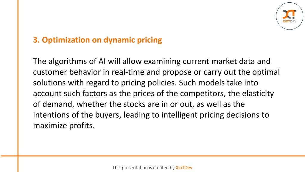 3. Optimization on dynamic pricing The algorithms of AI will allow examining current market data and customer behavior in real-time and propose or carry out the optimal solutions with regard to pricing policies. Such models take into account such factors as the prices of the competitors, the elasticity of demand, whether the stocks are in or out, as well as the intentions of the buyers, leading to intelligent pricing decisions to maximize profits. This presentation is created byXioTDev
