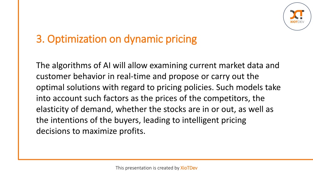 3. Optimization on dynamic pricing The algorithms of AI will allow examining current market data and customer behavior in real-time and propose or carry out the optimal solutions with regard to pricing policies. Such models take into account such factors as the prices of the competitors, the elasticity of demand, whether the stocks are in or out, as well as the intentions of the buyers, leading to intelligent pricing decisions to maximize profits. This presentation is created byXioTDev
